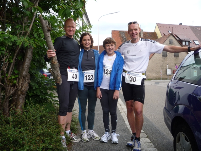 Mein Aufruf zum Leinburger Kirwalauf war nur von mäßigem Erfolg gekrönt. Albert erkärte mir noch am Freitag, dass er eine Muskelzerrung in der Wade hätte, aber trotzdem versuchen würde zu laufen. Zusätzlich versuchte er noch Anja und Felix zum Mitlaufen zu animieren. Anschließend wollten wir noch ein Bierchen in Leinburg assimilieren und danach nach Zabo oder Laufamholz zur Kirchweih gehen. Samstag morgen telefonierten wir noch miteinander und vereinbarten, uns gegen 15:00 bei der Brauerei zu treffen. Ich radelte um 14:30 von Laufamholz, mit Rucksack, Laufschuhen und Klamotten bepackt los und war auch kurz nach 15:00 bei der Startnummernausgabe. Albert war schon vorher angekommen und hatte meine Nummer abgeholt. Anja und Felix waren auch schon laufbereit und fieberten dem Start ihrer Strecke über 5Km entgegen.