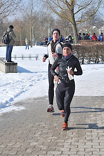 Nach den ersten 200-300 Metern war es dann aber mit den guten Wegeverhältnissen vorbei. Auf dem Schotterweg, war teilweise sulziger, nachgiebiger Schnee, nur eine Fahrspur von PKW’s war so fest gefahren, dass man hier relativ gut vorwärts kam. Der Effekt war dann aber, dass fast alle Läufer, wie auf einer Perlenkette aufgezogen, in der Spur rechts und links liefen – die Mitte wurde weitgehend gemieden, wegen des tieferen Schnee’s .
