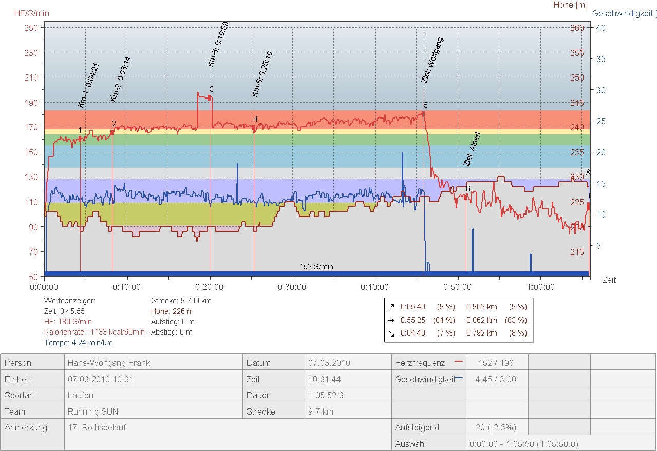 Jedenfalls merkte ich ziemlich schnell (nach ca. 2Km) dass es hier schon an die Substanz geht, wenn ich meine avisierte Zeit erreichen möchte. So lief ich dann auch größtenteils mit Puls von 168-174, was bei mir eigentlich schon Ende Gelände bedeutet. Den letzten Kilometer war ich dann mit Puls 175 – 183 Puls unterwegs. Aber ich erreichte noch ohne Sauerstoffzelt 🙂 das Ziel und war mit einer Zeit von 45:48 Min noch gut bedient. Das reichte für 8. Platz in der AK M45 und den 60. Platz gesamt(männlich).