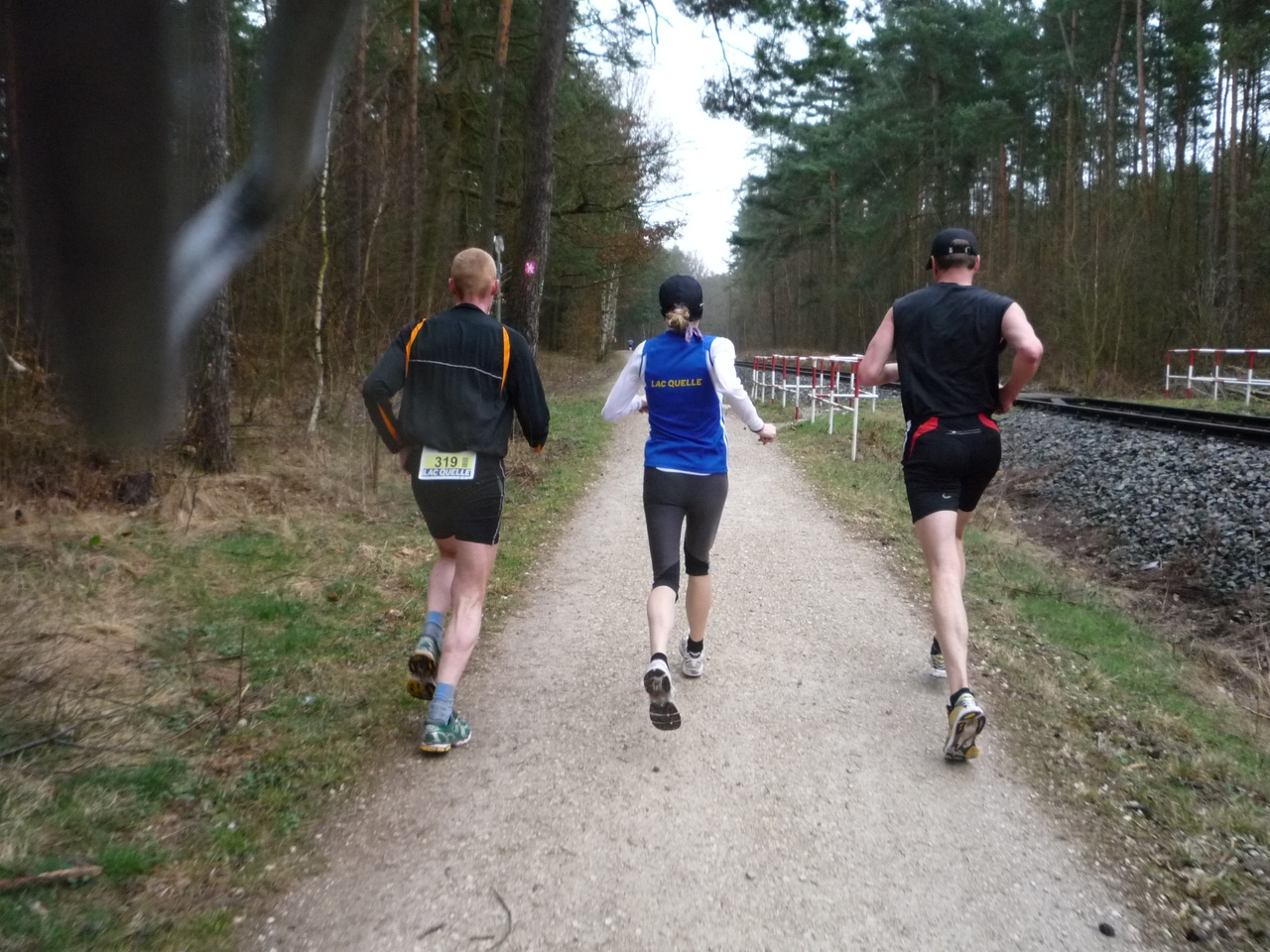 Von Albert war noch nichts zu entdecken – er hat sich doch wohl nicht verfahren? Ich lief die ersten Meter locker und ruhig und versuchte im Pulk Mitläufer zu endecken,die mein Tempo liefen. Etwa 1,5 Km nach dem Start hatte ich auf eine Zweiergruppe aufgeschlossen, die zwischen 4:05Min/Km und 4:15Min/Km liefen. Das entsprach in etwa dem Tempo, das ich zumindets für den Anfang laufen wollte. Bei genauerem Hinschauen stellte sich heraus, dass hier Kerstin, die führende Frau, lief. Mann – o – Mann, können Frauen rennen! Neben ihr lief Jens, dann hängte ich mich mit dran.