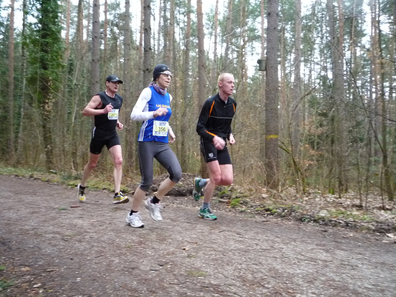 Der Start des Laufes war für 12:30 angesetzt. Die Witterung war, wie erwartet ziemlich kühl, leichter Niesel mischte sich ebenfalls immer wieder dazu. Ich entschied mich für kurze Hosen und langes Laufhemd. Nach dem Start ging es erst eine komplette Runde um den Sportplatz, bevor man dann im Dammbacher Wald verschwand.