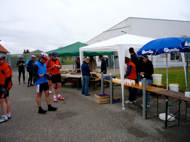 Die Strecke war sehr gut gewählt und auch ausreichend mit den klassischen, roten RTF-Pfeilen gezeichnet worden. Absolut entspannt ging es weiter nach Zautendorf, Deberndorf, Obereichenbach, Kirchfarnbach, Hirschneuses…und vor lauter quatschen waren wir auch schon bei unserer ersten Verpflegungsstation in Neuhof an der Zenn, unser Tacho zeigte 30 km an, DSCHW 33 km/h, löschten unseren Durst und klickten uns auch schon wieder ein.