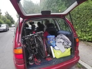 Am 11.08.2010 unternahmen Monika, Wolfgang, Julian und Peter sowie Erika eine MTB Tour zum Chiemsee. Zuerst war die Hin- und Rückfahrt mit der DB und dem Bayernticket geplant. Da dies aber unter der Woche erst ab 09:00 gültig ist, beschlossen wir mit dem Auto zum Chiemsee zu fahren. Da Monika einen neuen Radträger für die Anhängerkupplung mit Platz für 4 Räder besitzt, war dies die einfachste Möglichkeit. Wir packten unsere beiden Räder in den Sharan und trafen uns dann mit Monika und Julian am Mittwoch um 7 Uhr am OBI-Parkplatz in Lauf. Dort ludenwir unsere Räder auf den Radträger um. Anschließend gings dann los Richtung München.