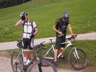 Gleich zu Beginn stellte eine steile Straße hinauf zum Wanderplatz alle vor eine erste Probe. Aber das war nur der Anfang…. Auf einem breiten Forstweg ging es zunächst ganz leicht ansteigend, dann aber mäßig bis steil in Kurven und Serpentinen bergauf. In den nächsten drei Stunden gab es KEINE flache Wegstrecke mehr. Der Schweiß floß bei allen, bis auf Julian, in Strömen. So ackerten wir den Berg, mit einigen Schiebepassagen und Pausen dazwischen, hinauf bis wir die Agergschwendtalm (1050m ü. NN)erreichten. Die Alm war leider gerade nicht bewirtschaftet – erst als wir wieder weiterfuhren kam der Almbesitzer um die Hütte zu öffnen.