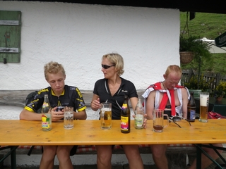 Auf der Enzianalm machten wir nun unsere wohlverdiente Pause. Die Sonne schien aus einem leicht wolkigen Himmel, es blies ein laues Lüftchen, die Hütte hatte eine wunderbare Terasse mit Bilck auf die umliegenden Täler, was will man mehr? Wir genehmigten usn nun der eihe nach Weizenbier (alkoholfrei), Wasser, Saft, Apfelschorle, Sprite, Spezi und dann eine vernünftige Mahlzeit.