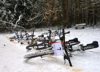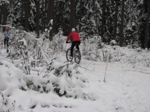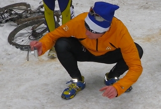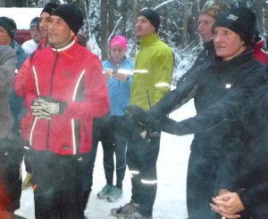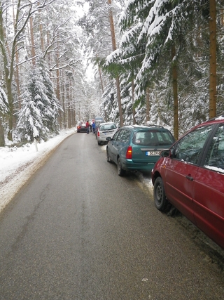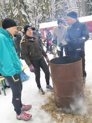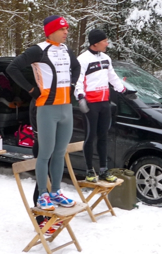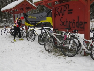 Nachdem wir uns nun doch kurzfristig für einen Start entscheiden haben (ich wollte ja eigentlich einen Rückzieher machen :-), war es am Samstag gegen 12:30 soweit. Wir luden unser Teambike in den Sharan und vertrauten uns dem Navigationssystem an.  Nachdem wir eine Woche zuvor schon beim Advent Biathlon vom Hubert Schwarz ein Stelldichein gegeben hatten(ich war allerdings nur für die Presse zuständig), war der Weg bekannt; zielsicher steuerten wir das Ungerthal an. Im tiefverschneiten Wald   waren auf einmal bunte Gestalten und Fahrzeuge zu sehen, die einem geheimnisvollen Platz zuströmten: