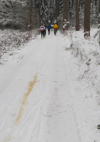 Aber dann wurde es ernst. Die Zauberlehrlinge wurden dazu verdammt, in 2-er Teams die nachfolgenden Aufgaben und Anstrengungen zu erledigen. Der Zauberschneeradlauf begann mit einer seltsamen Startzeremonie.  Jeweils der erste  Zauberlehrling aus jedem  Team stellte sich an der Startlinie bereit, um eine kleine Steigung hinauf zu spurten und nach Umrundung eines Hütchens seinen 2-ten Mann/Frau abzuklatschen. Nun lief dieser ebenfalls die Steigung hinauf und wieder herunter, während der 1-te gemütlich sein schlafendes 2-Rad weckte. Sobald der 2-te Lehrling in Sicht war wurde das 2-Rad immer unruhiger und konnte nur mitMühe am durchgehen gehindert werden.