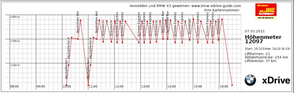 | 07. Mrz. 2011 | Hochzillertal | 12.097 hm | 23 Lifte | 154 km |