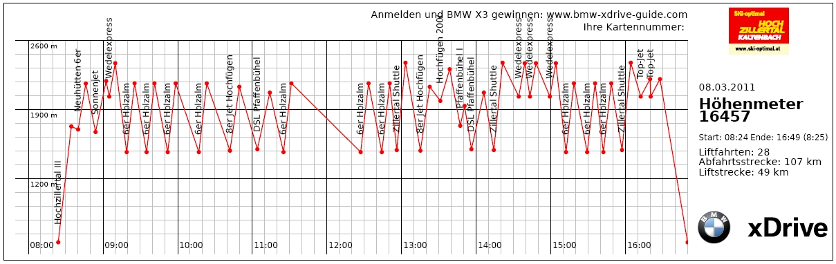 | 08. Mrz. 2011 | Hochzillertal | 16.457 hm | 28 Lifte | 107 km |