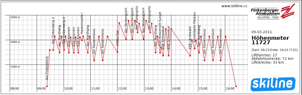 | 09. Mrz. 2011 | Finkenberg | 11.727 hm | 27 Lifte | 72 km |