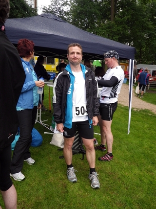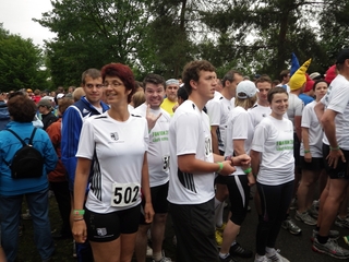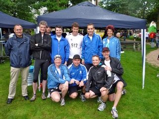 Der Start rückte nun langsam näher und wir sammelten uns vor dem Start/Zielbogen. Jacken wurden ausgezogen, ein bischen aufgewärmt, gestrecht, und dann war es schon soweit. Mit einem lauten Knall aus der Startpistole spritze die Meute los. Es hatte wieder leicht zu nieseln begonnen, was aber eher angenehmer war, als die Hitze der letzten Jahre. Die Strecke verlief wie im Vorjahr, als0 aus dem Südwest heraus auf die Hauptstraße und den leichten Hügel hinauf, dann auf die nächsten 2 Kilometer immer leicht bergab.