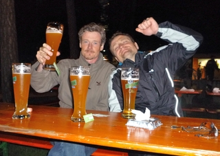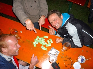 Mit Weizen, Cola sowie etlichenBratwurst- und Schnitzelweckla wurden die verbauchten Ressourcen wieder aufgefüllt. Zu später Stunde, es waren nur noch Albert, Stefan, Thomas und Wolfgang zugegen, traf uns dann das Glück mit voller Breitseite: Wie aus dem Nichts tauchte ein edler Spender auf, der sich seiner 1-Euro Wertmarken entledigen wollte. Das wir die bisher lautstark unterstützt hatten meinet er, wir wären die passen Leute für diese Spende. An dieser Stelle noch einmal ein herzliches