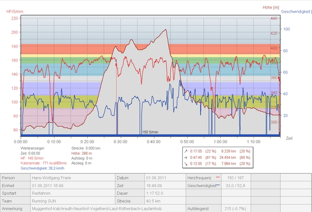 Heute mal wieder eine kleine Feierabendrunde über Kalchreuth gedreht. Diesmal nicht über Günthersbühl nach Behringersdorf, sondern über Neunhof, Vogelherd und Lauf. Dann nach Rückersdorf und Röthenbach wieder zurück. Schöne 40Km bei Spitzenwetter; kein Wind oder Regen !! Am Schluß waren es dann im Schnitt 33Km/h.