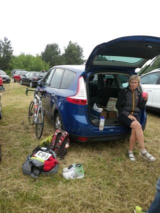 Danach zusammen mit Erika ein Brötchen reingeschoben und eine Tasse Kaffee assimiliert. Erika wollte sich heute unseren Staffeltriathlon auch einmal ansehen und durfte daher auch so früh aufstehen. Kurz nach 07:00 haben wir dann unsere Taschen und Utensilien ins Auto gepackt, um Stefan und Bernhard abzuholen. Es passte auch alles ins Auto und gegen 7:40 verließen wir Nürnberg Richtung Osten, Steinberger See. Die Fahrt verlief ohne Zwischenfälle und nach einer knappen Stunde waren wir auch schon angekommen. Wir parkten auf einer Wiese oberhalb des Sees und tranken zur Beruhigung noch eine Tasse Kaffee.