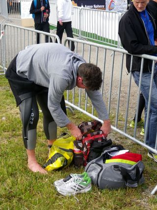 hörten wir uns noch die „Wettkampfbesprechung“ an, dann war es auch schon an der Zeit für Bernhard, in seinen Neopren zu steigen. Ich hatte das Gefühl, dass er ziemlich aufgeregt war. Das war natürlich verständlich – es war sein erster Triathlon überhaupt….