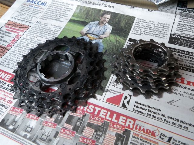 - Das alte Ritzelpaket. Die Ritzel 4-10 habe ich nochmals gereinigt; hier lassen sich eventuell noch einige wieder nutzen. Der Rest ist Schrott