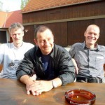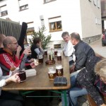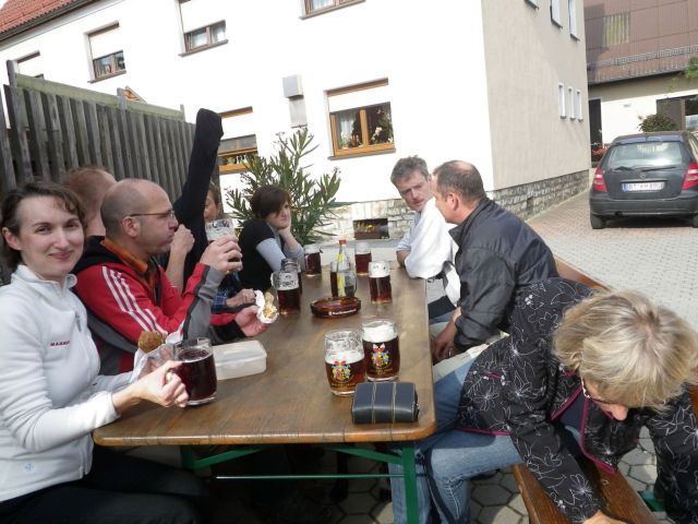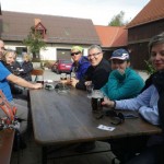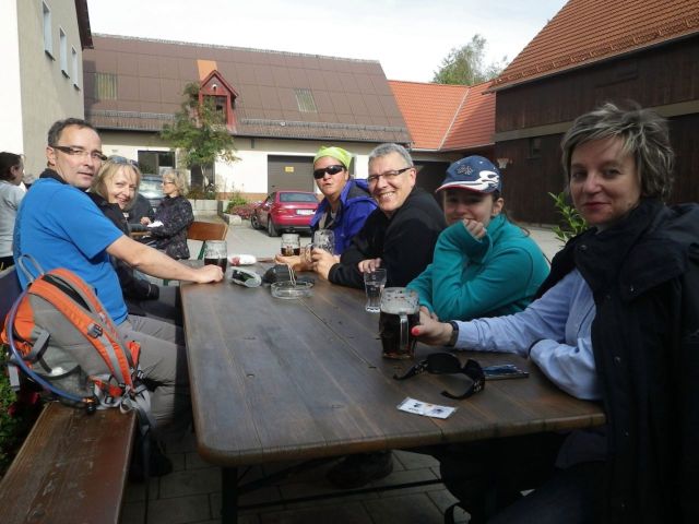 Zuerst leicht bergauf, dann eben und auf einem schönen, sonnigen Weg in den Wald hinein. Dort wieder einen sandigen Pfad bergauf, bis wir auf eine kleine Straße und abgeerntnete Felder gelangen. Wir folgen weiterhin der Beschilderung und biegen nach links auf die Straße ein. Nochmals kurz bergauf, dann wieder bergab und schon werden die Dächer von Leups sichtbar. Bei Sonnenschein belegen wir 2 Bänke im Hof der Brauerei und stürmen die Gaststube (im Garten keine Bedienung). Der Gastwirt scheint ob des Ansturmes leicht überfordert. Hier wird nämlich nicht aus der Schankanlage gezapft, nein, ein kleines Holzfass steht auf einem Bock, und von dort wird jedes Seidla extra eingeschenkt. Es dauert zware einige Zeit, aber nach ca. 15Min hat doch jeder mindestens 1 Glas Bier vor sich stehen. Da ist es fast schon nebensächlich, das wir 2 Radler zuviel bestellt hatten.