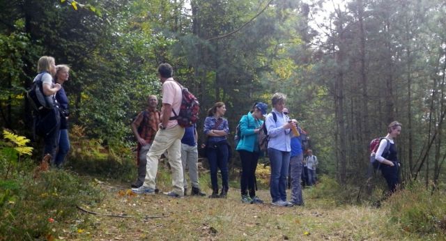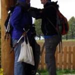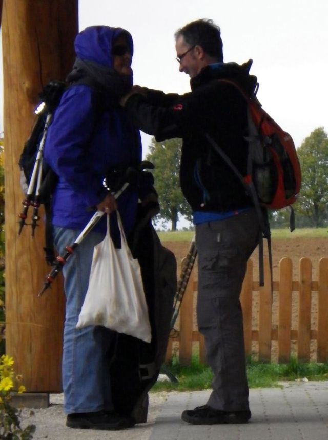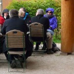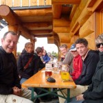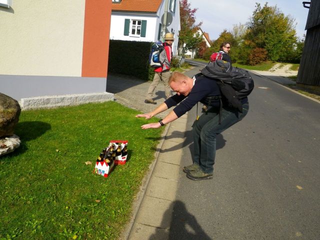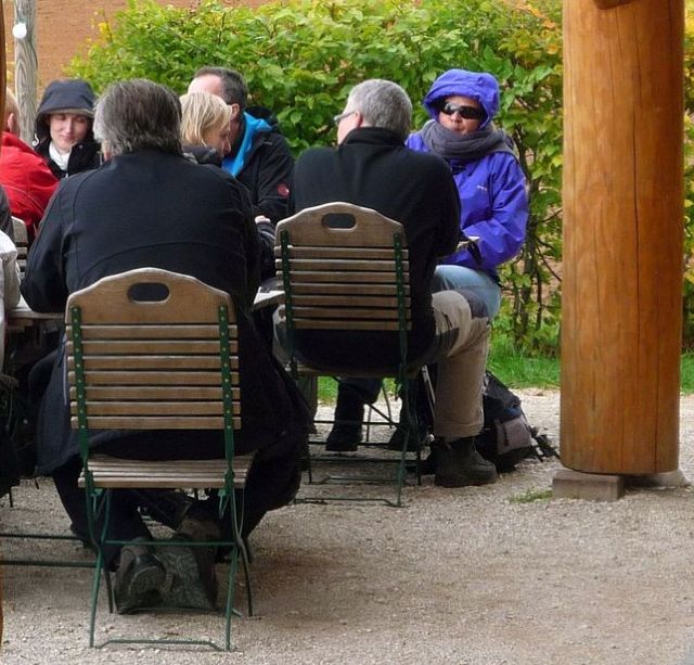 Hier wird nun kräftig gespeist. Die Tische biegen sich vor lauter guten fränksichen Speisen. Auch wenn die Sonne inzwischen gänzlich hinter einer dicken Wolkendecke verschwunden ist und ein böiger Wind um das Holzhaus pfeift: Das helle Bier schmeckt trotzdem. Aber alles Schöne hat auch hier ein Ende und so machen wir uns wieder auf den Weg nach, wo wir schon heute früh einmal Rast gemacht hatten.