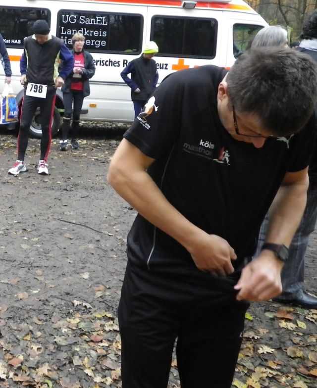 Die Wege und Böden im Start/Zielbereich waren gut aufgeweicht und schön matschig. Solange es aber nicht noch zum Regnen anfangen würde, sollte es nichts ausmachen. Michael entschied sich nun doch für ein kurzes Hemd + Jacke, ich beließ es bei dem langen Shirt.