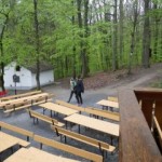 Und schon war auf der gegenüberliegenden Talseite unser nächstes Ziel sichtbar: Die Kapelle auf dem Kreuzberg. Wieder führte der Weg leicht bergab in den Talgrund und letztmalig bergauf. Dann bogen wir rechts herum um die Kapelle und der Traum aller Bierwanderer tat sich auf: Drei große Bierkeller nebeneinander, alle Plätze frei !!
