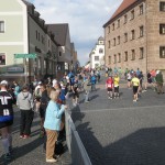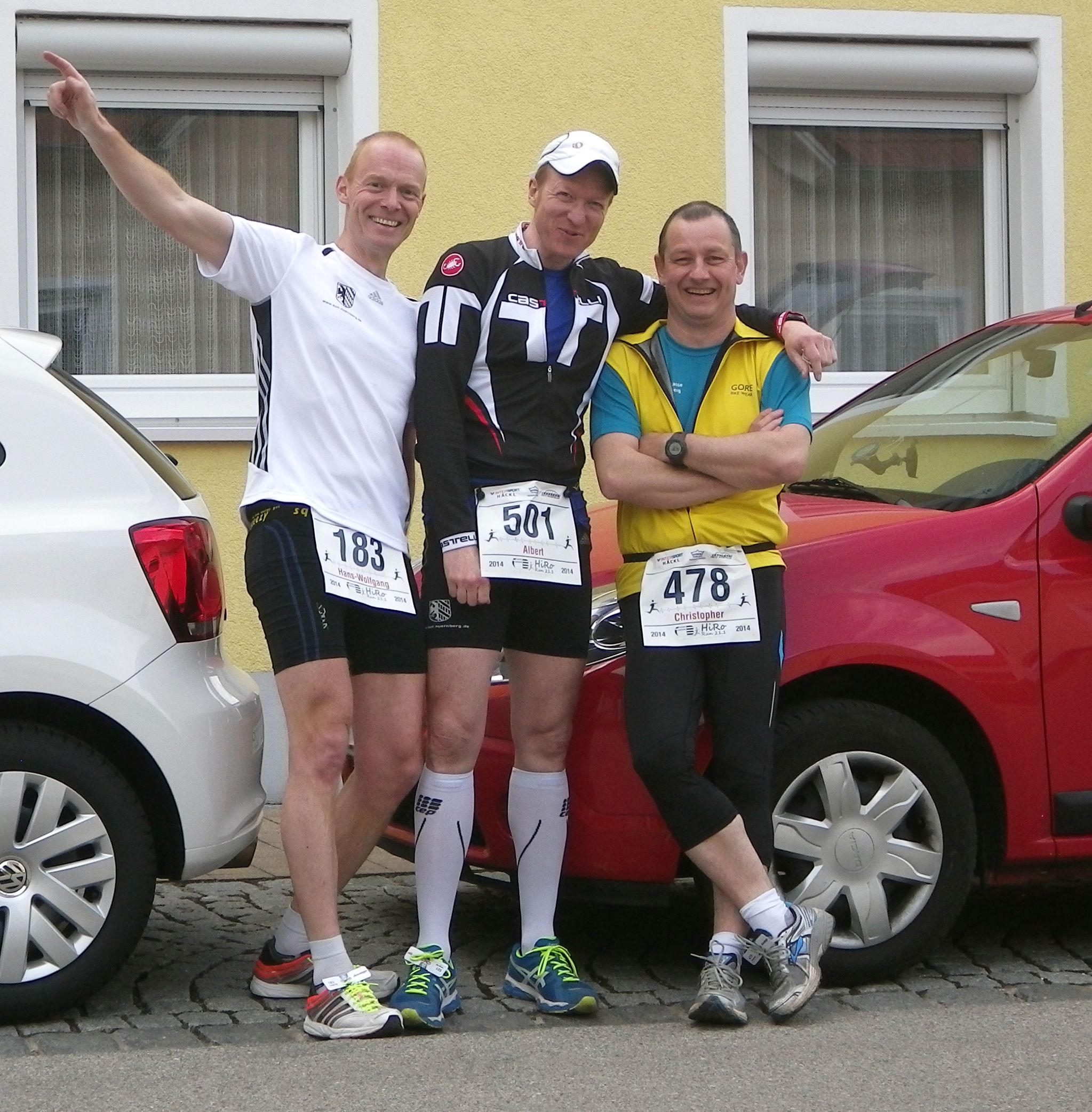 Pünktlich um 15:30 machten sich Albert, Christopher und Wolfgang sowie Erika, sowie Peter und Carina als „Supporter“ auf den Weg nach Hilpoltstein. Nach kurzer Fahrt über die Autobahn erreichten wir HP und parkten fast an derselben Stelle wie 2013. Wir besorgten uns die Starterbeutel an der Ausgabestelle, schlenderten nochmals über den Marktplatz, wo schon reges Treiben herrschte, und versuchten Michael in der Menge ausfindig zu machen. Leider erfolglos. Nach kurzer Suche entschieden wir, zuerst zum Auto zum gehen, um uns in die Rennsuits zu zwängen. Christopher entschied sich für eine 3/4 lange Hose, Albert trat wie ich in kurz an. Fertig „gedresst“ ging es wieder zum Marktplatz und Start/Zielbereich.