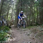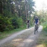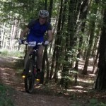 Die ersten 500m ging es noch leicht und locker über Straßen und einen Schotterweg. Kurz nach einem Parkplatz am Waldrand wurde dann mal kräftig die Muskulatur eingeheizt. Rein in den Wald und schnurstracks und steil über Wurzeln bergauf. YEAAAH. Der erste Anstieg war genommen, und die nächsten 6Km waren leicht und locker, meist bergab, zu pedalieren. Aber wirgendwie müssen ja 110HM zusammenkommen. Von Km6 – Km10 folgten in kurzer Folge kernige Anstiege auf wurzeligen Pfaden. Danach war es bis Km18 ein dauerndes Auf und Ab mit steilen Rampen und Gefällstrecken. Steinge Pfade, häufig mit Wurzeln durchsetzt sowie flowige, schmale Pfade durch den herrlichen Mischwald – einfach Klasse. Nur selten druch breite Forstwege unterbrochen! Ab Km18 ging es bis zur ersten Verpflegungsstation bei Km 29 fast nur bergab. Hier war Radbeherrschung und gedrosseltes Tempo gefragt – ein Sturz auf dem steinigen Terrain sollte vermieden werden.