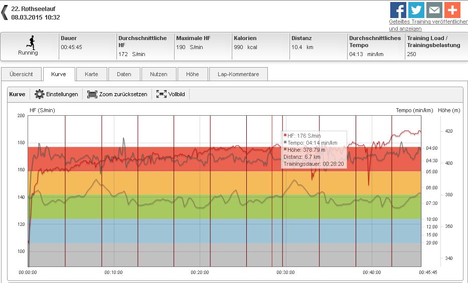 Bei Kilometer 1,8 und 7,3 seltamerweise Fehlmessungen des Polar GPS Sensors. Daher keine Pace von 4:13Min sondern 4:24Min/Km.