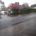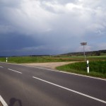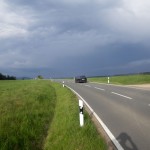 Ich entschied mich in der Regensburgerstraße für die Feuchter Alternative. Aber schon am Ortsausgang von Feucht waren dunkelste Wolken Richtung Moosbach, Winkelhaid, Altdorf zu sehen. Ob das gut geht ?? Ca. 1,5Km vor Winkelhaid wurde die Straße feucht und kurz darauf setzte heftiger Regen ein. Ich hielt kurz an, um die Regenhülle um den Rucksack zu legen, in der Hoffnung, in Winkelhaid eine überdachte Bushaltestelle als Unterstand zu finden. Es dauerte keine Minute, da ging ein Wolkenbruch mit Hagelschauer nieder, der die Temperatur um gefühlte 20Grad sinken ließ.