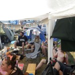 Welch Glück dass wir bis ca. 8:30/ 9:00 Schatten haben. Ab ca. 10:30 hält man es im Freien, ohne Sonnenschutz, nicht mehr aus. D.h. nach dem „Frühstück versammeln sich erstmal alle unter dem Pavillon’s, dann wird mal kurz die „Tages- und Bandplanung“ angesprochen. Duschen, oder nicht Duschen hängt von den Menschenschlangen vor dem Duschcenter ab – für mich heute: nix duschen, Deo muss reichen!