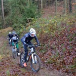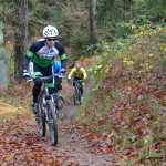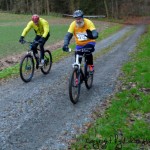 Die zweite Disziplin erfolgte in Form eines Jagdstarts. Die Teilnehmer starteten mit den Zeitrückständen, die sei beim Schwimmen auf den Erstplatzierten hatten. Ich startete daher 3:14 nach dem Ersten, Julian 1:11 nach dem Ersten, also 2 Min. vor mir. Die Veranstalter sortierten die Teilnehmer anhand der Zeitrückstände in einer langen Reihe ein, dann ging es auch schon los. Nach 3 Min. war ich an der Reihe, trat volle Kanne in die Pedale, solange es noch eben war. Die ersten 200m fuhr man noch auf der Tartanbahn des Sportplatzes, bevor es aus dem Sportgelände heraus auf einen Schotterweg leicht ansteigend ging. Weiter ging es auf einer kleinen Straße, über eine Kuppe, und dann die nächsten ca. 1000m nur Bergab. Zuerst noch Teer, dann Schotter, zum Schluß folgte ein Waldweg. Hier konnte man noch kräftig Gas geben. Ab dem Waldweg stieg die Strecke wieder an, es folgte wiederum eine Schlüsselstelle, eine 180 Grad Kehre nach links, steil ansteigend, und im Übergang vom Waldweg zum Trail stark aufgeweicht, matschig, rutschig. Dieser Trail war aber trotzdem recht gut befahrbar, mit Gras durchsetzt und eigentlich griffig. Immer stetig ansteigend ging es dann die nächsten 600m weiter, bevor man wieder auf einen Schotterweg nach links einbog. Jetzt folgte eine Gefällstrecke, und wenn man nicht aufpasste schoß man an der Abbiegung zum Singletrail gnadenlos vorbei. Dieser folgte nach weiteren ca. 300m, und bog 90% nach links in den Wald ab. Hier sollte sich jeder MTB Trailfahrer wohl fühlen. Ein fußbreiter, schmaler, kurviger, teils matschiger Pfad führte bergab, es folgte ein absolut aufgeweichter, ebenfalls matschiger und furchiger Gegenanstieg, bevor man sich dem letzten Gefälle wieder mit vollem Einsatz und Risiko entgegen stürzen durfte. Ein Klasse Trail, könnte länger sein !!!