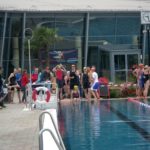 Wir zogen uns um, packten Taschen und Räder aus, montierten die Räder zusammen, und pilgerten mit etlichen anderen Athleten zum Königsbad Forchheim. Nach kurzer Orientierung fanden wir auch die Startnummernausgabe, klebten Zettelchen auf Helm, Taschen und Rad und zogend dann zum Check-In Bereich weiter. Nach dem Aufstellen der Räder, Platzieren aller notwendigen Utensilien, gingen wir die Wechselzone ab, um uns den Wegeverlauf ein zu prägen. Gerade bei der Erstteilnahme an Tria-Wettbewerben ist dies wichtig, um später im Wettkampfstress und Getümmel nicht hilflos im Wechselbereich zustehen und das Rad unter 450 anderen zu suchen, oder sich im Geflatter der Absperrbänder zu verlaufen. 🙂