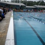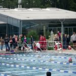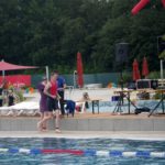 Stefan hatte das große Los gezogen und durfte in der dritten Startwelle um 9:35 ins Wasser. Er freute sich tierisch, endlich das warme Naß am klammen Körper zu spüren 😆 Es lag immer noch Hochnebel über Forchheim, kein Sonnenstrahl durchbrach die Wolkendecke, die Lufttemperaturen waren für Ende Juni bescheiden ..