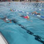 Stefan startete auf Bahn 6, mit 7 weiteren Athleten. Vom Start weg schwamm er vorneweg und führte auf seiner Bahn das Feld an. Ab der 7./8. Bahn schloß aber ein weiterer Schwimmer auf und überholte Stefan ab Bahn 8. Der Abstand war allerdings nicht groß und blieb konstant. Nach 11:33 Min. verließ er das Becken und spurtete Richtung Wechselzone.